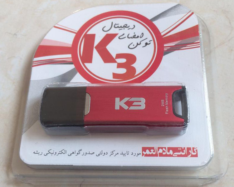 مدل K3توکن امنیتی یک دستگاه فیزیکی است که در اختیار فرد شناسایی شده قرار گرفته و عملیات تصدیق هویت او را بهبود می بخشد، این توکن ها برای اثبات هویت الکترونیکی شخص مذکور در شرایطی همچون درخواست برای دسترسی به حساب بانکی یا تایید هویت آنها از طریق امضاهای الکترونیکی استفاده میشوند.